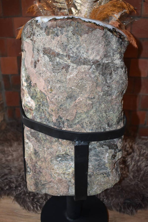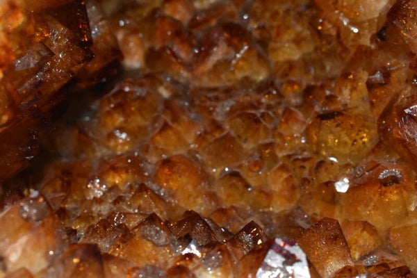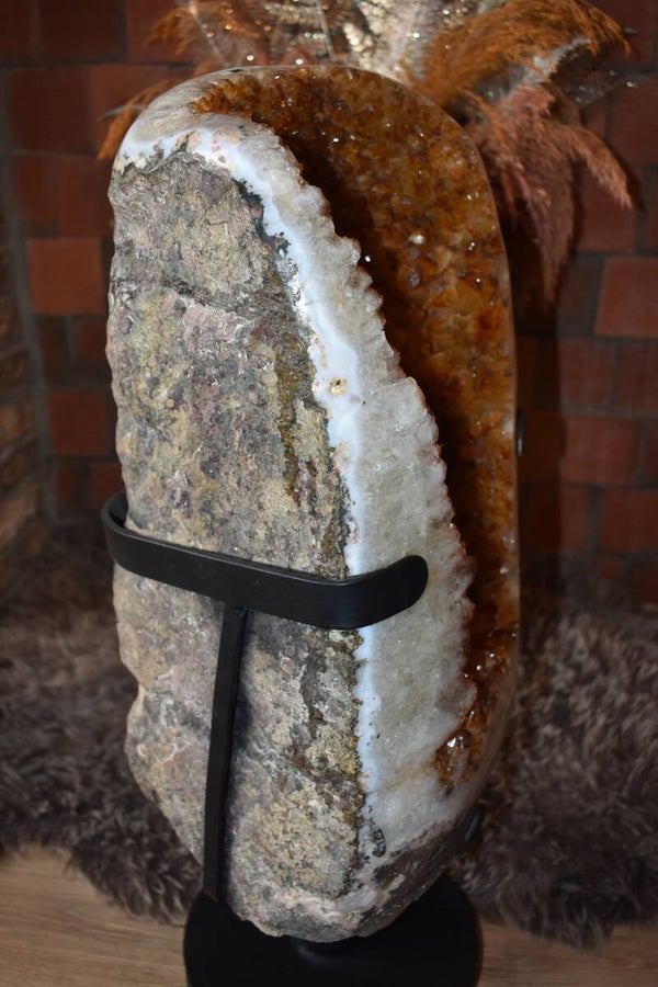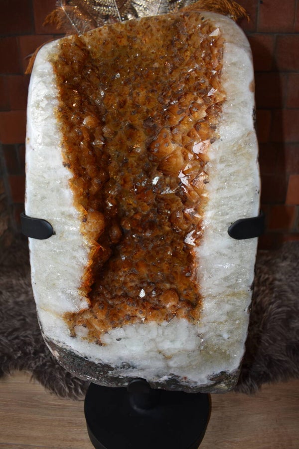 Sublime géode de citrine de grade AAA, montée sur un socle métallique élégant pour une mise en valeur parfaite.