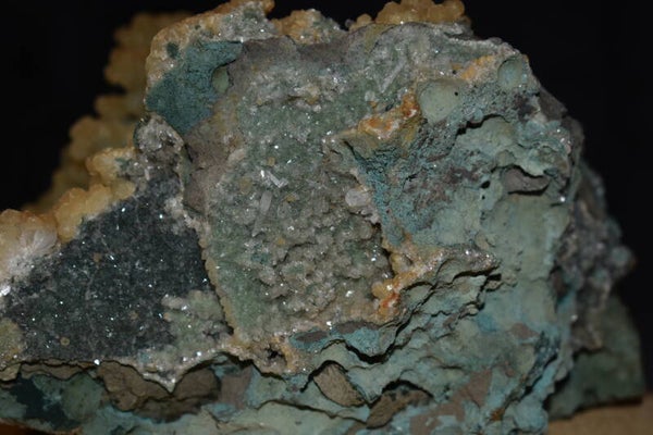 Chaque face montre une texture différente : du botryoïdal parfaitement rond, du bleu minéral profond, et une zone cristallisée plus brute au dos.