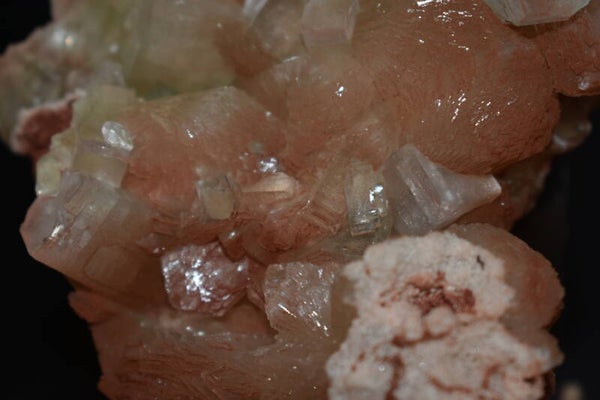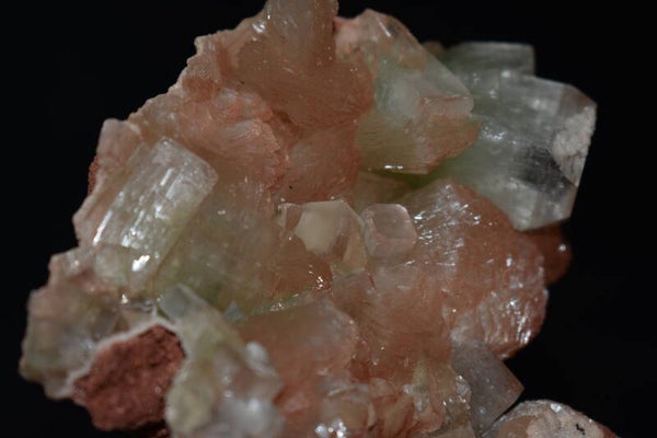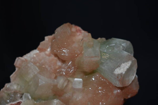 Pièce rare et très élégante mêlant Apophyllite verte translucide et Stilbite pêche rosée, formant un ensemble harmonieux, doux et lumineux.
