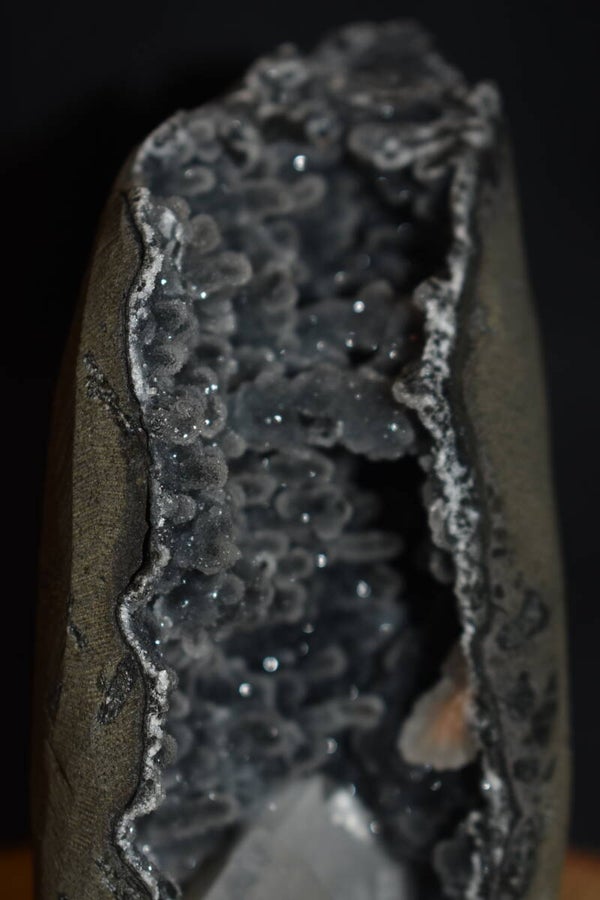 Les parois internes présentent des formations botryoïdales très fines typiques de la calcédoine indienne, avec un effet « ciel étoilé » extrêmement recherché.