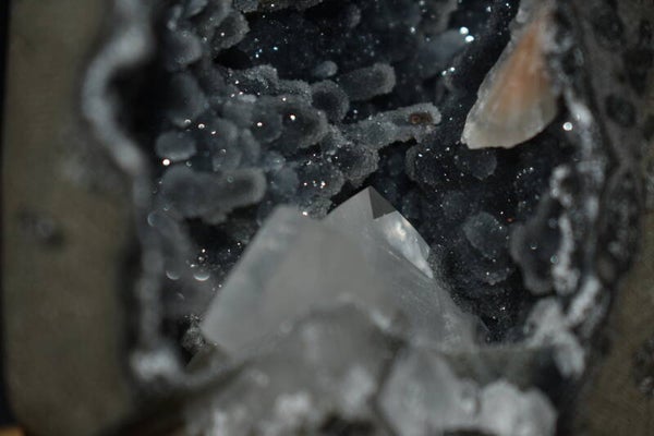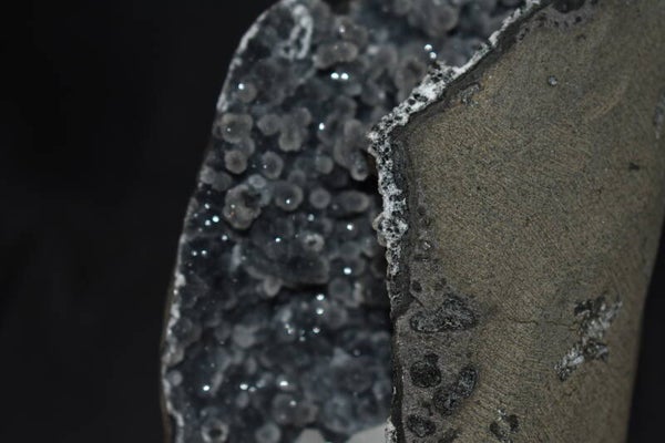 Magnifique géode de calcédoine gris-bleu foncé, ouverte naturellement, révélant une cavité profonde tapissée de micro-cristaux scintillants.
