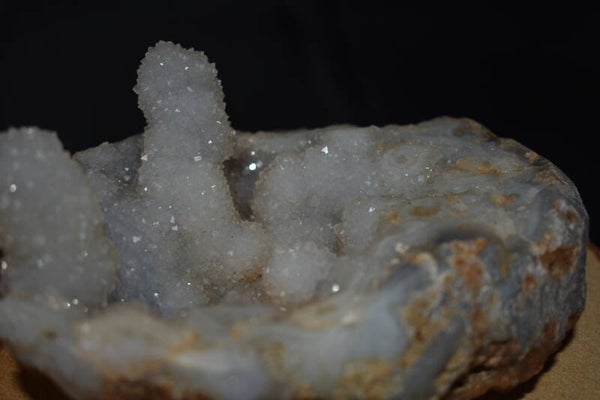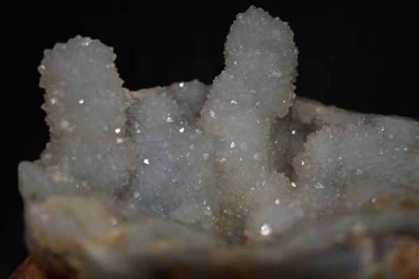 Magnifique géode de calcédoine présentant trois colonnes cristallisées, une formation recherchée et très esthétique que l’on retrouve uniquement sur certaines zones d’Inde.