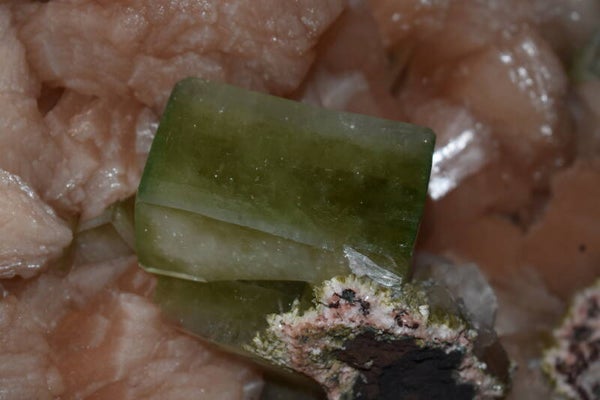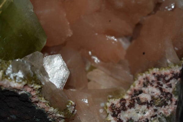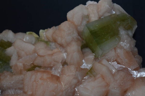 La stilbite, dans ses teintes pêche pastel, forme des structures organiques et aériennes, presque florales, qui contrastent magnifiquement avec les blocs d’apophyllite verte, limpides et lumineux.