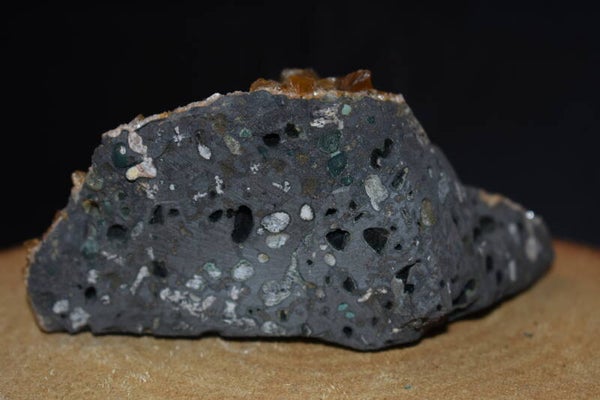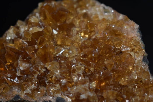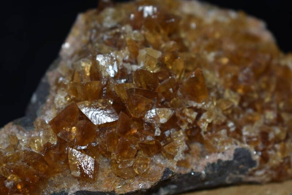Magnifique formation de calcite miel, avec des cristaux lumineux aux reflets dorés parfaitement déposés sur une matrice de basalte volcanique.
