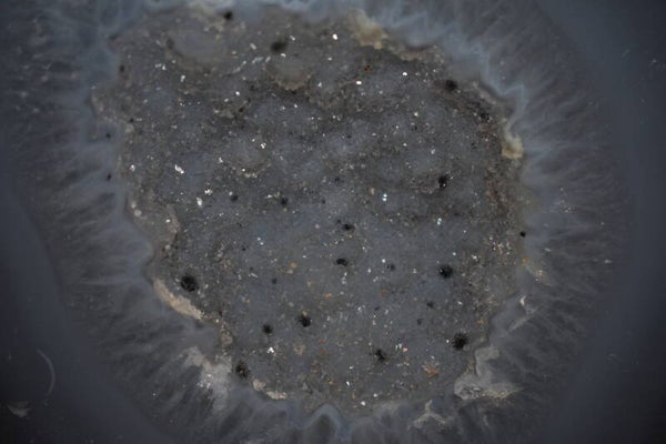Cette géode d'agate présente un cœur en druse exceptionnel, très lumineux, avec une finition de coupe parfaite. Les cristaux sont d’une finesse rare, très brillants, avec ce léger voile givré autour de la cavité qui donne un effet “halo” naturel.