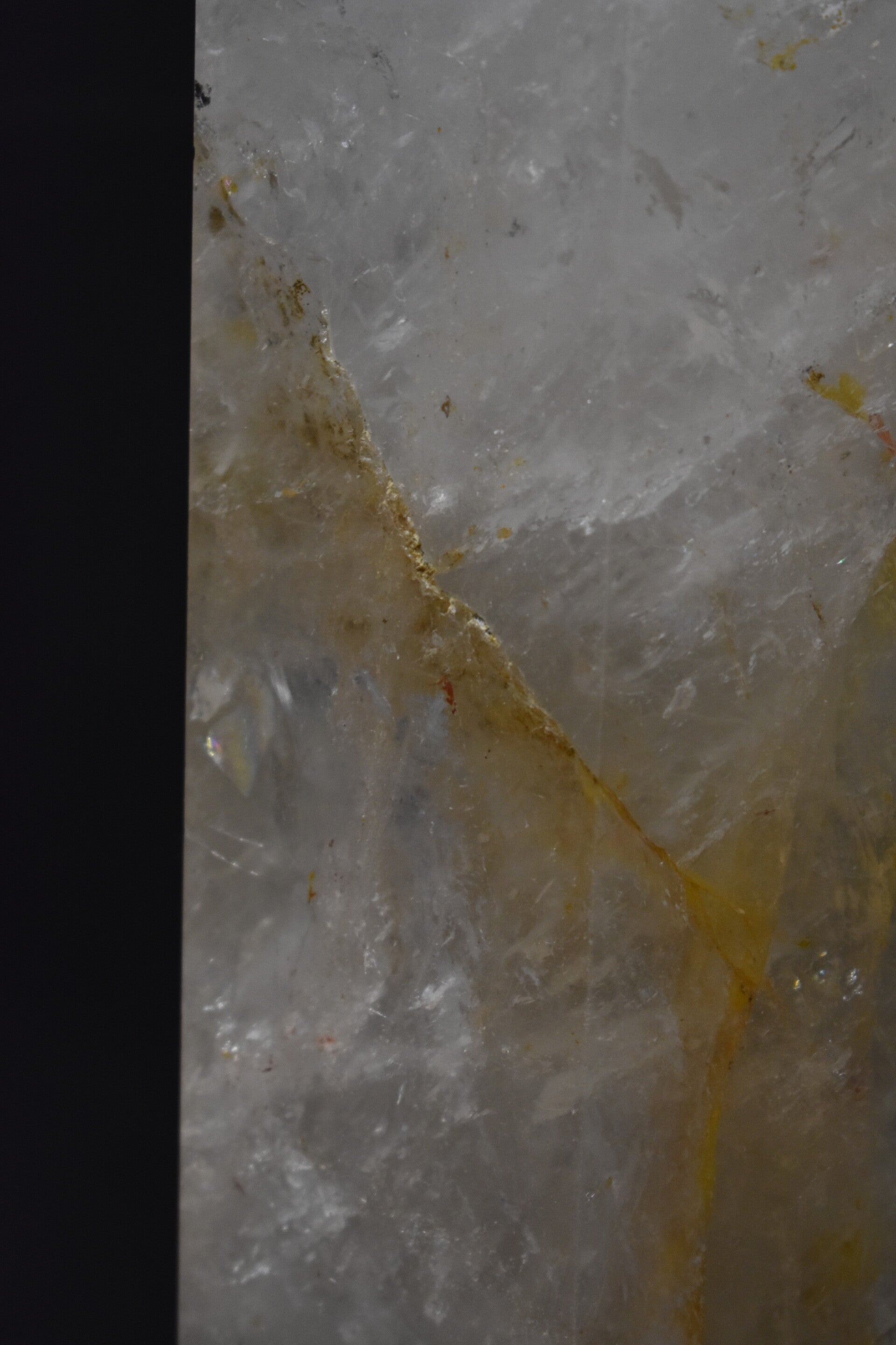 La teinte dorée provient de micro-inclusions naturelles d’oxyde de fer (limonite, goethite, hématite fine).