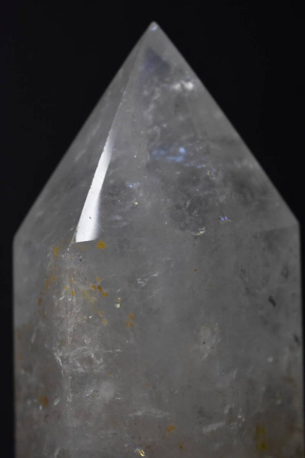 Impressionnante pointe de quartz clair de 2,724 kg et 32 cm présentant une teinte naturellement dorée, due à la présence d’inclusions ferrugineuses (principalement limonite et oxydes de fer).