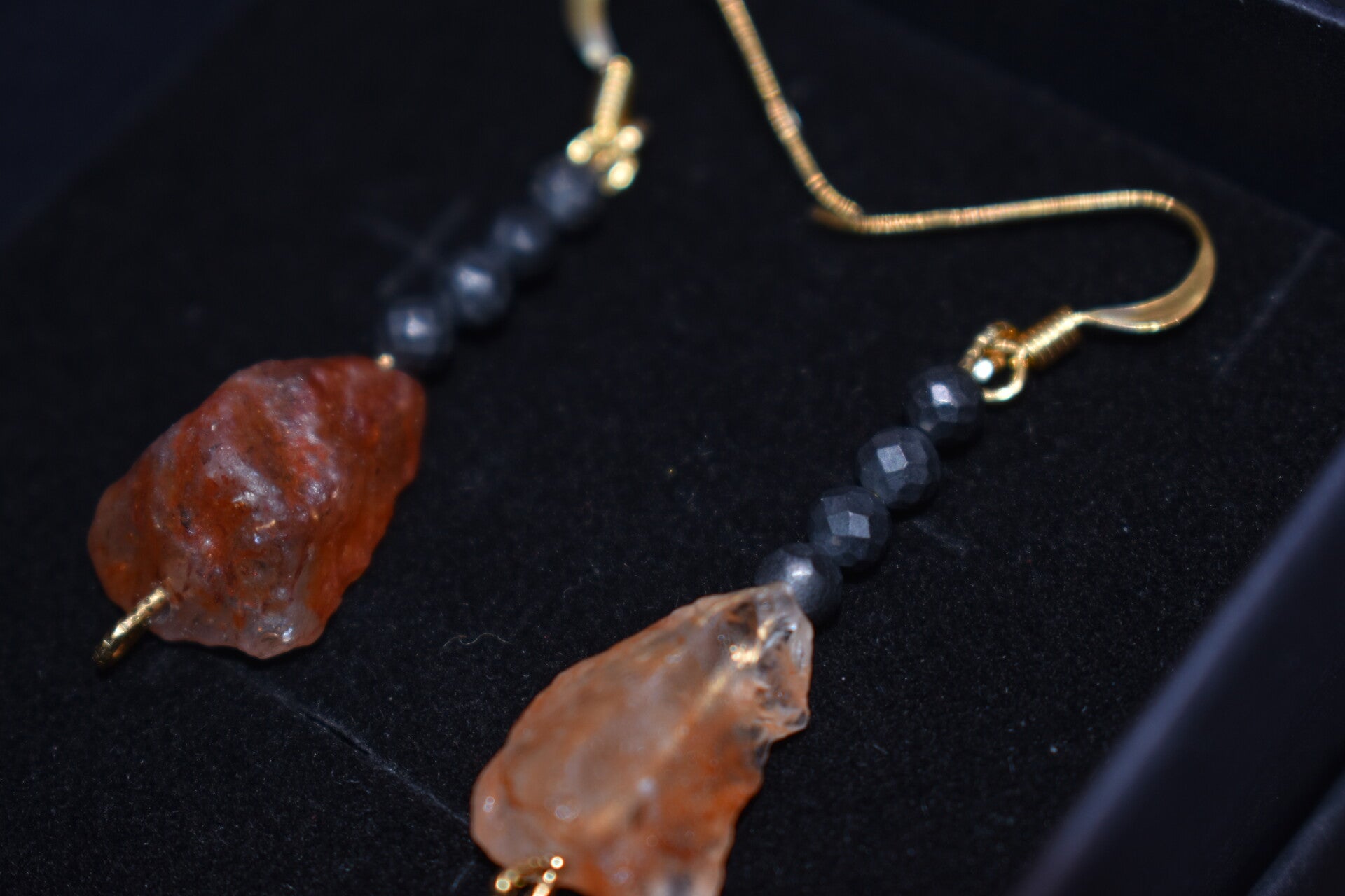 Ces boucles d’oreilles associent la chaleur lumineuse de la pierre du Soleil brute à l’élégance sobre de la shungite facettée, montées avec soin sur argent 925 doré à l’or fin.