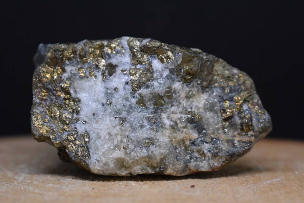 Belle pièce naturelle composée de chalcopyrite aux reflets doré-cuivrés reposant sur une matrice de quartz blanc.