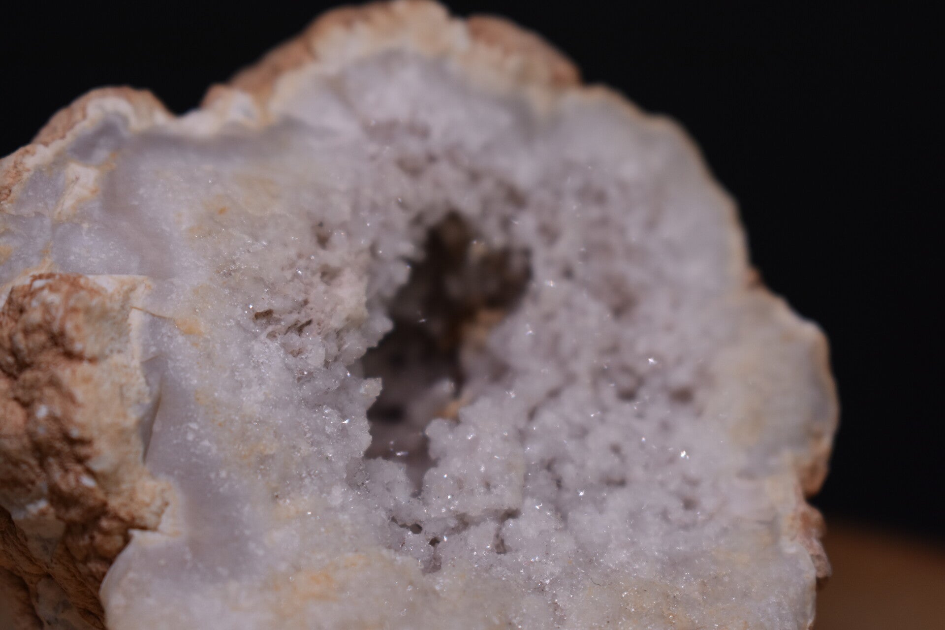 Charmante géode naturelle composée d’une enveloppe de calcédoine microcristalline blanche et beige, renfermant une cavité centrale tapissée de fines cristallisations de quartz.