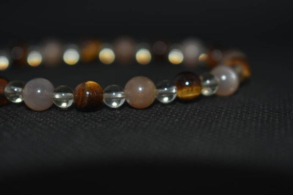 Il associe des pierres naturelles soigneusement sélectionnées pour leurs teintes chaleureuses et leur énergie solaire, évoquant la lumière, la confiance et l’élan de vie.