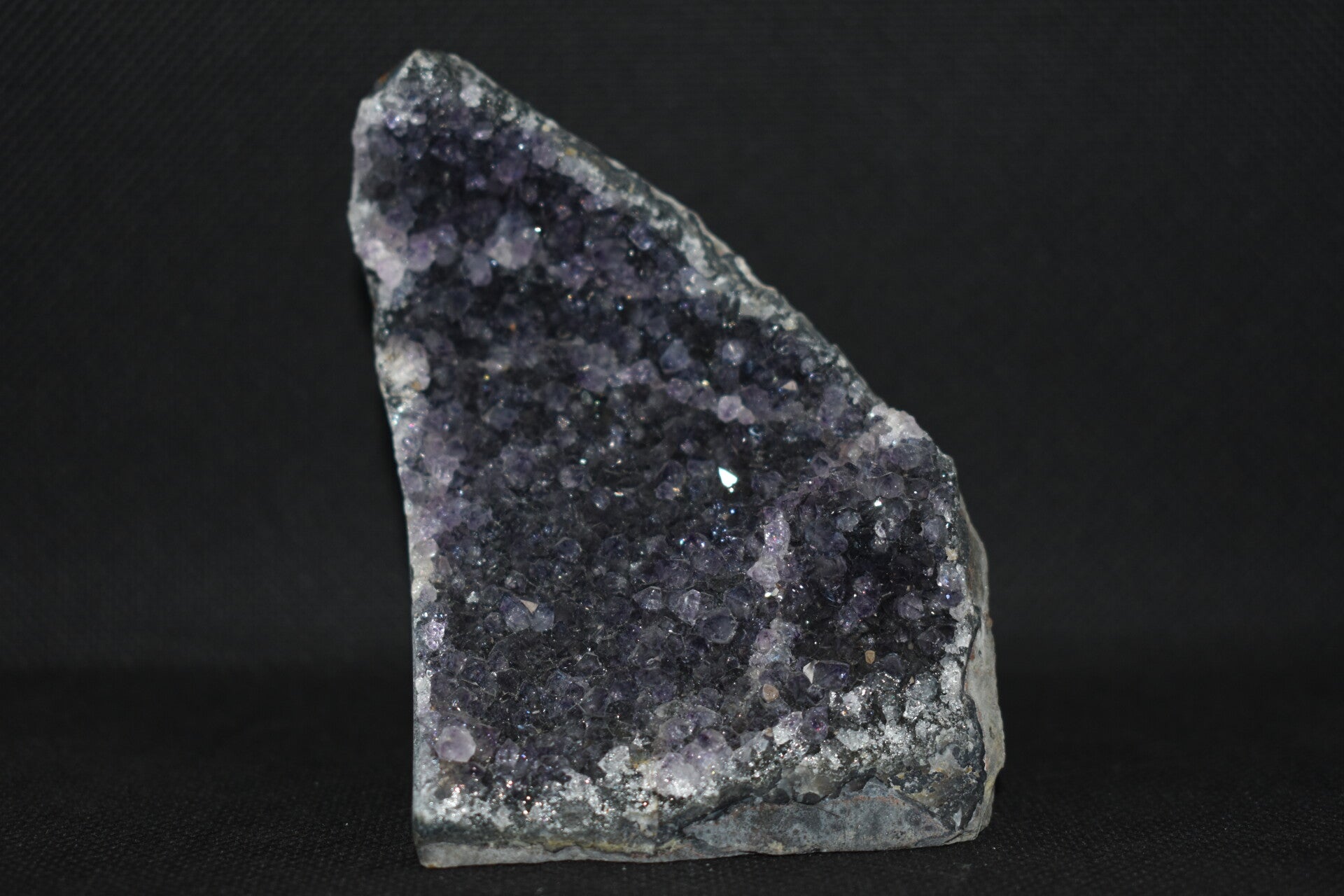 La surface est composée de cristaux serrés et délicats, offrant un aspect dense et texturé. Selon l’angle et l’éclairage, la géode révèle des reflets subtils allant du violet très foncé à des nuances plus claires, renforçant son caractère unique.