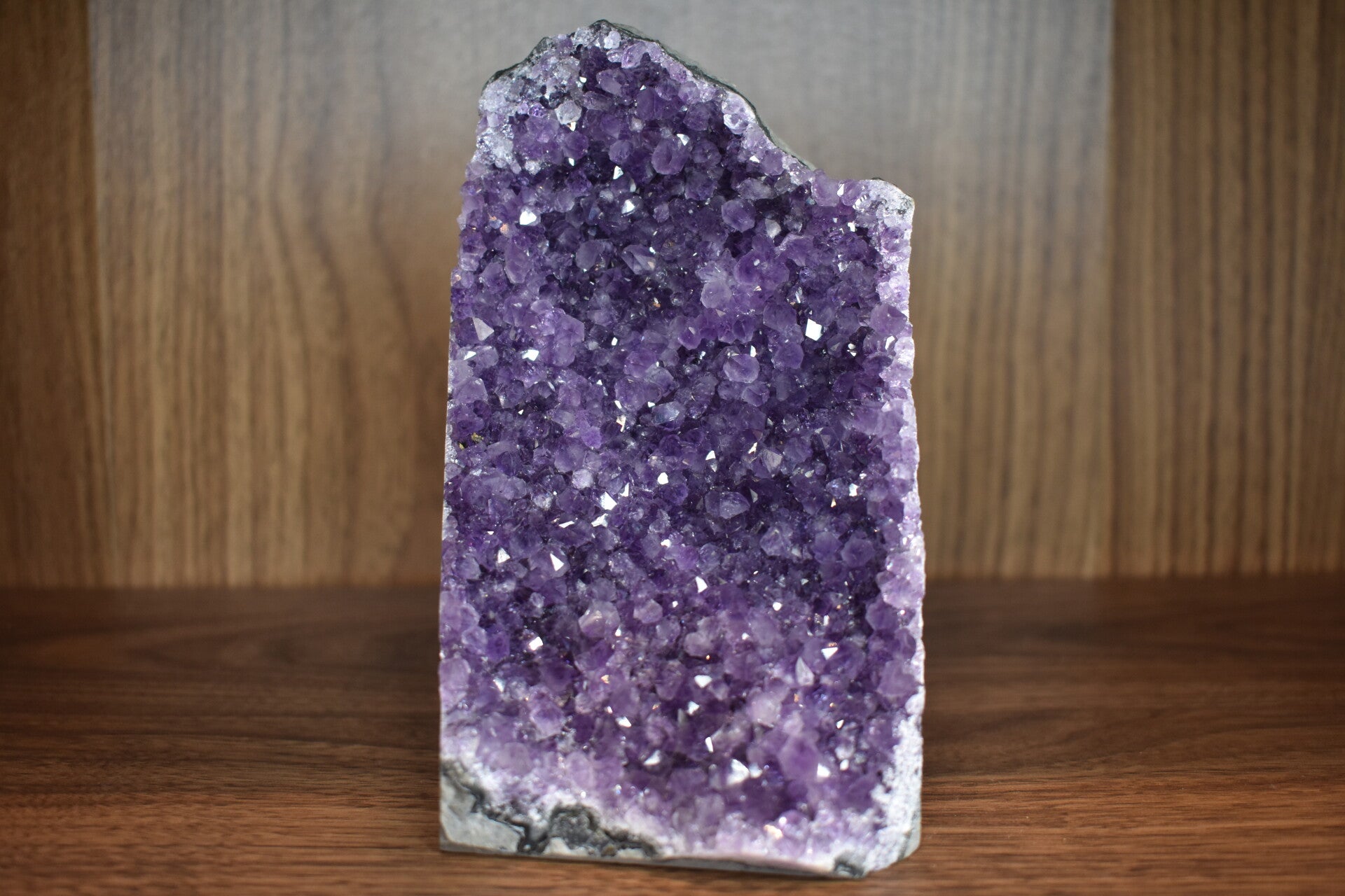 Imposante géode d’améthyste naturelle présentant une surface entièrement recouverte de cristaux violets brillants. Sa structure large et homogène offre un effet visuel puissant, avec une multitude de reflets sous la lumière. Sa forme droite et compacte lui donne une présence forte, idéale pour une mise en valeur en vitrine ou en décoration intérieure.